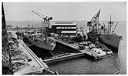 The shipyard was opened on 21 September 1918 with the launch of the first ship, the steamer Torild, built by Rederi AB Percivald in Landskrona. The company expanded quickly and by Autumn 1920 the yard had grown to 15 hectares (37 acres) with a 150-metre (490 ft) long fit-out in 7 metres (23 ft) of water. In 1922, the shipyard could build eleven new vessels of 50,000 tonnes (49,000 long tons; 55,000 short tons), but it was declared bankrupt due to poor economic conditions. New Oresund Shipbuilding Company (Swedish: Nya Varvsaktiebolaget Öresund) was formed in April 1923 which could build seven vessels of 26,000 tonnes (26,000 long tons; 29,000 short tons) deadweight. In 1935, the company name was changed to Öresundsvarvet AB.[2] A floating dock for vessels up to 5,000 tonnes (4,900 long tons; 5,500 short tons) was purchased from Copenhagen in 1936. The shipyard was taken over in 1940 by Götaverken, who then supplied the shipyard's newbuildings with new machinery. During World War II, the yard built a coastal destroyer and two minesweepers. In all, during the period from 1931 to 1944 the shipyard built fifty ships totalling 220,000 tonnes (220,000 long tons; 240,000 short tons).[3]