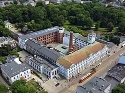 The infrastructure and edifices of Łódź were built at the expense of industrialists and business magnates, chiefly Karl Wilhelm Scheibler and Izrael Poznański, who sponsored schools, hospitals, orphanages, and places of worship.[39] From 1872 to 1892, Poznański established a major textile manufactory composed of twelve factories, power plants, worker tenements, a private fire station, and a large eclectic palace.[40] By the end of the century, Scheibler's Księży Młyn became one of Europe's largest industrial complexes, employing 5,000 workers within a single facility.[41] The years 1870–1890 saw the most intense industrialisation,[42] which was marked by social inequalities and dire working conditions.[43] Łódź soon became a notable centre of the socialist movement and the so-called Łódź rebellion(pl) in May 1892 was quelled by a military intervention.[43]