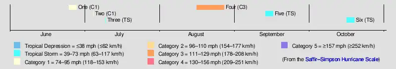Five of the six tropical cyclones affected land, including three making landfall with winds of over 74 mph (119 km/h). The first struck Texas as a hurricane, which caused moderate to heavy damage, particularly to shipping in Matagorda Bay. One death was indirectly related to the hurricane, as well as at least two injuries.[3]
