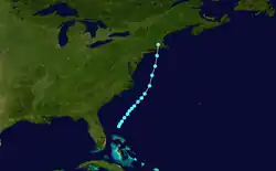 On September 13, a tropical storm was first observed about 225 mi (360 km) southeast of Cape Hatteras, North Carolina.[3] A nearby ship with the call sign Cushnoc reported estimated winds of 60 mph (95 km/h), which was judged to be the peak intensity of the tropical storm. Another ship on September 16 reported similar winds in the same location;[11] Thus, it was estimated to have remained nearly stationary for three days. Its complete track is unknown.[3]
