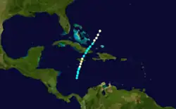 The track for this storm begins about 290 mi (465 km) northwest of Barranquilla, Colombia, on October 31,[3] one day before Jamaica first observed sustained hurricane-force winds.[13] Moving towards the east-northeast, the storm attained hurricane status on November 1, while situated just south of Jamaica. Upon making landfall in the island nation near Rocky Pointon November 2, the storm strengthened into a Category 2 hurricane with 105 mph (165 km/h) winds. After crossing Jamaica, the system weakened into a Category 1 hurricane and then further into a tropical storm prior to making landfall in eastern Cuba late on November 2. The system emerged in the Bahamas on the next day, and strengthened into a hurricane once again early on November 4. Several hours later, the hurricane was last sighted to the northeast of the Bahamas.[3]