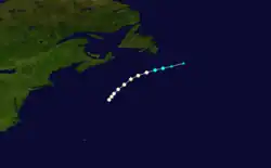 On September 9, the ships Annie and Lilly, Alfred, and Astor each encountered this storm south of Atlantic Canada.[11] Because the Alfred observed a barometric pressure of 970 mbar (29 inHg), HURDAT begins the track of this cyclone as a hurricane with winds of 90 mph (150 km/h) about halfway between Bermuda and Nova Scotia.[4][5] The hurricane did not strengthen and began to gradually weaken as it moved to the south of Newfoundland. It weakened to a tropical storm early on September 11 and transitioned into an extratropical cyclone several hours later.[5]