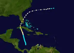A tropical storm was discovered north of Panama on October 12. The storm moved very slowly and generally northward. It became a hurricane early on October 17 and passed just east of Grand Cayman.[17] It attained a peak intensity of 115 mph (185 km/h) just before making landfall on Bejucal in western Cuba, where the barometer dropped as low as 958 mbar (28.3 inHg) on October 19.[18] The calm center of the storm passed over the capital Havana and then turned northeastward as it entered the Straits of Florida.[3] Just before 00:00 UTC on October 20, the eye of the cyclone struck Key West, Florida.[3] About six hours later, early on October 20, the hurricane made landfall on the mainland near Chokoloskee with winds of 105 mph (165 km/h) and emerged into the Atlantic near Sebastian around 12:00 UTC.[3] In passing over Eau Gallie near Melbourne, the calm eye lasted about four hours between 08:30–12:30 UTC.[19] The cyclone later passed north of Bermuda before dissipating on October 23.[5]