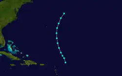 While the bark Mary M. Williams reportedly encountered this storm before September 12, the official track for this system begins on that day due to the system's close proximity to the Lesser Antilles, which allowed more observations to confirm its existence.[3] Considered a hurricane at the beginning of its track, the storm moved generally westward and passed either or over Anguilla, Saint Barthélemy, and Saint Martin late on September 12. By early the next day, the cyclone briefly intensified into a Category 3 hurricane, peaking with winds of 115 mph (185 km/h), several hours before striking Puerto Rico between Yabucoa and Humacao. The system moved west-northwestward across the Mona Passage and struck the Dominican Republic, weakening to a tropical storm on September 14 as it traversed Hispaniola. Thereafter, the storm briefly re-attained hurricane status while crossing the Windward Passage early on the next day and soon made landfall in Cuba near San Antonio del Sur. Weakening to a tropical storm, the cyclone continued west-northwestward until turning northward over the central part of the island, barely avoiding Florida on September 16. The storm became a hurricane again early on September 17, several hours before striking near Wilmington, North Carolina. The storm moved parabolically across the interior of the United States, dissipating on September 19 near Cape Cod, Massachusetts.[5]