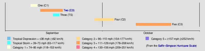 Two September 12–19 Category 3 hurricane 115 (185) 980 Lesser Antilles (Puerto Rico), Greater Antilles (Dominican Republic, Cuba), Florida, the Bahamas, North Carolina, Virginia, Northeastern United States >$30,000 32 [3][8][9]