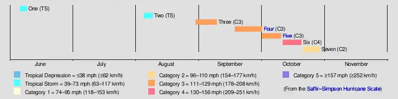 Three August 30 – September 9 Category 3 hurricane 115 (185) 948 None Unknown 1 [13]