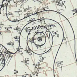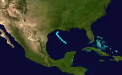 A ship first observed this tropical storm about 245 mi (395 km) north-northwest of Telchac Puerto, Yucatán, at 12:00 UTC on September 16.[1][5] The storm intensified gradually while moving northwestward, peaking with maximum sustained winds of 70 mph (115 km/h) at 00:00 UTC on September 18. However, the cyclone soon quickly weakened, falling to tropical depression intensity about 18 hours later. It then dissipated about 70 mi (115 km) south-southwest of the Texas–Louisiana state line.[1]
