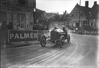 In August, the AC de la Sarthe et de l’Ouest[19](forerunner of the Automobile Club de l'Ouest) ran its event.[20] On the Saturday was the inaugural Cyclecar grand prix for the newly formed Union Motocycliste de France (UMF).[21] The next day was the Coupe de le Sarthe, run concurrently with voiturettes. Pilette entered four Mercedes cars for himself and the three works drivers. Peugeot was not present so it became a contest between the German cars and the French Delage and Th.Schneider teams. Honours went to Delage with a 1-2 victory for Bablot and Guyot, ahead of Pilette and veteran Otto Salzer in their Mercedes – the last chain-drive cars in A Grand Prix-level event.[6] The voiturette class was won by Jean Porporato in a Grégoire.[21]