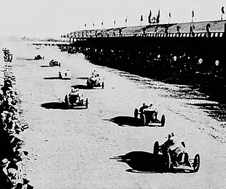 The race was started by Benito Mussolini, the recently appointed Prime Minister and ardent racing fan.[40] Bordino drove despite his broken arm, with his mechanic doing the gear changes but it did not slow him down. He set a blistering pace and led for over half the race until the exhaustion of the effort finally overtook him and he had to retire. Nazzaro took the lead but when he had to stop to refill water with just two laps remaining, Salomano overtook him and held on for the victory.[40] Murphy finished third, his race compromised by the car's lack of traction on the road-circuit portion. This marked the first Grand Prix win for a supercharged car,[35][41] and Salomano's new lap record of 3:46.4 (159.08 km/h) eclipsed Bordino's one of 3:55 (146.9 km/h) from the year before.[42] Although it was his only major triumph, he remained a test-driver for Fiat until the 1960s.[26][12]