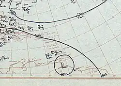 About two hours after striking Venezuela, the hurricane entered the southeastern Caribbean Sea. For the next few days it maintained its intensity while tracking to the northwest. A ship on June 30 reported a pressure of 982 mb (29.0 inHg), suggesting winds of about 100 mph (160 km/h). The next day, the hurricane passed south of Jamaica and turned more to the west before resuming a northwest motion. At around 06:00 UTC on July 3, the hurricane made landfall on western Cuba with winds of 100 mph (160 km/h). It weakened while crossing the island, although it maintained hurricane status upon entering the Gulf of Mexico.[1] On July 4, a strong high pressure area over the eastern United States turned the hurricane to the west.[2] After restrengthening, the storm attained peak winds of 110 mph (180 km/h) on July 5, based on a ship report of a pressure of 965 mbar (28.5 inHg). It maintained that intensity for about 18 hours, and during that time the hurricane turned to the southwest. At 01:00 UTC on July 8, the hurricane made its final landfall near La Pesca,[1] about halfway between Tampico, Tamaulipas and Brownsville, Texas.[2] The intensity at landfall was estimated at 85 mph (137 km/h). After moving ashore, the hurricane rapidly weakened over the high terrain of northeastern Mexico, and the storm dissipated at around 12:00 UTC on July 8.[1]