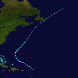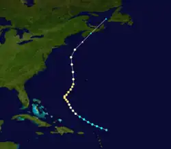 A tropical storm was first observed about 140 mi (225 km) north of Anguilla on September 19. The storm moved northwestward and quickly attained hurricane status on September 20. After turning to the northeast, the hurricane reached a peak intensity of 105 mph (165 km/h) on September 21 while located about 500 mi (805 km) southwest of Bermuda. It turned to the north and slowly weakened. A cold front turned the hurricane to the northeast, and the system became extratropical on September 25 a short time before making landfall on southern Nova Scotia. Hours after striking the providence, the extratropical remnant was absorbed by the approaching cold front while located over the Gulf of St. Lawrence.[9]