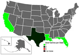 ![]() Number of bowl games per state | |||||||||||||||||||||||||||||||||||||||||||||