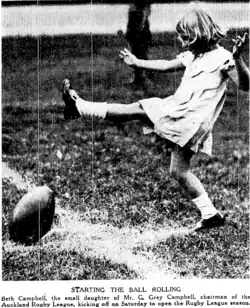 It was announced in mid March that Lawson Park would be developed. It would involve "earthworks of which will take from four to five months to complete. After this stage both areas have to be grassed and other finishing touches added". It had been started four years earlier "as a means of creating work in the district for the local unemployed, but was halted when sustenance was introduced. Some months ago work was recommenced, giving work for 20 men. When it is finished, it will provide two basketball [better known as netball at this time] and two tennis courts on a higher level, and on the lower part a rugby or rugby league football ground". It was said that "to provide for the football ground, a good deal of excavation will be necessary, so that ultimately a fine, natural grandstand will be secured".[26] Twenty nine years later, in 1967 the New Lynn Rugby League club was established and Lawson Park became its home ground with their club rooms being built there.