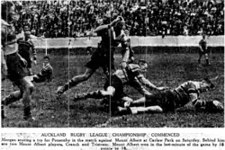 Mount Albert were a suggested location for Bob Banham as they needed a "link between the rugged Mount Albert forwards and the inside backs, where the weakness lay last season".[16] Ted Mincham joined Mount Albert from Richmond and "with McNeil and McCallum outside him the Mount Albert three-quarter line should be a bit of a problem for their opponents... [while] their forwards appear to be just as strong as last season".[13] They were to be coached by former New Zealand player Stan Prentice. Following the first preliminary round of games at Carlaw Park on April 2 it was said that they "have a good solid pack of forwards and have an exceptional back in R. Burgess who has great dash and pace [and that they] will further strengthen their team for the competition matches. It is probable that they will gain Lilburn, a good five eighths from Hunua. McRobbie, the Pokeno forward, while there is a possibility that Cliff Satherley, the former Richmond and Mount Albert forward will lead the pack.[13] In mid May it was reported that Mount Albert had signed R.F. Ball who was a member of the Eastern Suburbs club in Sydney.[17]