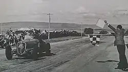 John Snow receives the chequered flag to win the 1939 Bathurst 150 miles road race in a Delahaye