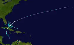The most powerful cyclone of the season was first noted as an intensifying hurricane east of the Leeward Islands early on September 12. It moved steadily west-northwest, passing north of Puerto Rico as a Category 2 hurricane and moving through the Turks and Caicos Islands at Category 3 intensity. The mature storm attained its peak as a Category 4 hurricane with winds of 130 mph (210 km/h) after crossing Andros, Bahamas and soon began a gradual west-northwest turn. It moved ashore the northern end of Key Largo at 19:30 UTC on September 15, progressing into mainland Florida near Homestead, and whereupon the cyclone became the third strongest hurricane to hit Miami-Dade County, Florida on record.[18] The system then curved north throughout the central portions of the state before emerging offshore and making a second landfall near Savannah, Georgia, with winds of 70 mph (110 km/h). A continued northward track brought the cyclone into the South Atlantic States, where it completed extratropical transition roughly 50 mi (80 km) east-northeast of Danville, Virginia. The post-tropical cyclone fluctuated in strength and was last noted east of Newfoundland on September 20.[2]