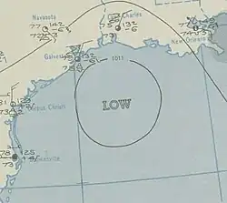 A tropical wave organized into a tropical depression in the central Gulf of Mexico by 06:00 UTC on July 19. The system moved west-northwest after formation, reaching tropical storm intensity early the next day. Despite a well-established circulation as indicated by weather balloons,[3] peak winds did not exceed 40 mph (64 km/h) throughout the storm's duration. It turned west and then west-southwest offshore the southern Texas coastline, weakening to a tropical depression early on July 22 and dissipating about 30 mi (48 km) offshore six hours later.[2] Although cyclone warnings were issued along the Texas coastline upon the storm's formation, and boats at Aransas Pass were moved into harbors, impact was negligible; winds peaked at 30 mph (48 km/h) with medium to high tides.[11] Squally weather and rough seas were observed along the coastline from Grand Isle, Louisiana to Port Aransas, Texas.[3]
