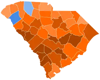 However, sufficiently few of these poorer whites voted that Thurmond was able to easily carry South Carolina, winning 44 of the state's 46 counties and over 71 percent of the total presidential vote. Thurmond exceeded 72 percent in all but twelve counties, and passed ninety percent in ten. This was the first time any county in South Carolina had voted against the national Democrats since 1900.[26]