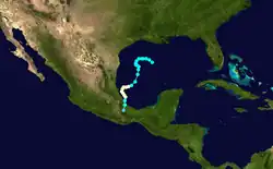 A tropical wave entered the Gulf of Mexico on September 18.[8] It moved northwestward and developed into a tropical storm on September 20, while offshore Louisiana. The storm continued northwestward, then turned to the southwest, and erratically looped to the south on September 22. Steadily strengthening as it tracked south-southwestward, the storm intensified into a hurricane on September 24. After turning to the southwest, it reached its peak intensity on September 25. The hurricane weakened as it turned to the south-southeast then south and fell to tropical storm intensity shortly before making landfall between Veracruz and Nautla. The system dissipated by September 26.[6] Operationally, the storm was treated as two separate storms, due to reconnaissance aircraft being unable to report a center of circulation on September 23.[8] The storm produced 2 to 3 ft (0.61 to 0.91 m) higher than normal tides along the coast of Texas and Louisiana, while its outer rainbands produced locally heavy rainfall.[8]