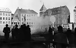 Rocks and eggs were tossed at the building, some breaking the windows and one narrowly missing the head of the Parliamentary president, until the Reykjavík police force, aided by volunteers from the Independence Party intervened, beating rioters down and eventually launching tear gas grenades at the rioters.[1] It was the first time police in Iceland used tear gas against protesters and the only time until 2009, when police used it during the Icelandic financial crisis protests.[2]