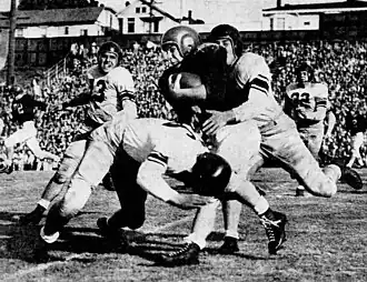 Replete in a shiny leather helmet, Webfoots halfback Hal Cuffel (1929–1959) gets sandwiched by two Cal Bears in the team's meeting at Multnomah Stadium in Portland.