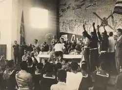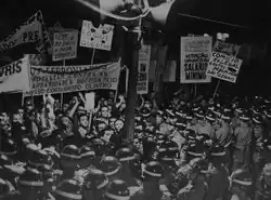 In the Armed Forces, movements of low-ranking personnel such as sergeants and sailors clashed with officers over internal demands, such as the rights to run in elections and to marry, and also advocated for reforms.[35] There were organized intellectuals, and some Catholics formed the Popular Action. Students campaigned in the National Union of Students (UNE). The PCB was well organized and successful in the unions in cooperation with the PTB. Leonel Brizola stood out within the political class, attracted fame with the expropriation of American companies and had many followers.[33] He unified groups in favour of the base reforms into the Popular Mobilization Front and mobilized his political base into the Grupos dos Onze.[36]