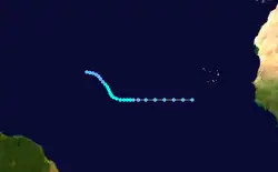 A tropical wave exited Senegal on September 18 and progressing westward near Cabo Verde. A day later, it developed into Tropical Depression Fifteen. It moved across the Atlantic, dissipating on September 27 after entering the eastern Caribbean.[3]