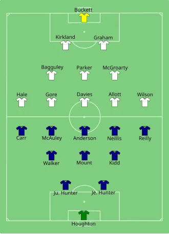As conditions deteriorated in the second half, England scored twice more without reply. Wendy Owen reported that Gore scored again and Pat Davies got one,[15] while Sue Lopez credited Davies with both England's second half goals.[16] The English and Scottish FAs report England's goals came from Gore, Lynda Hale, and Jeannie Allot.[17][18]