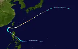 The monsoon trough spawned a tropical depression east of the Philippines on May 10. It tracked generally westward, reaching tropical storm status on the 13th while remaining poorly organized. On the 14th Olga relocated to the southeast, and regained tropical storm strength after weakening. The storm headed to the northwest, and looped in response to the approach of a long wave trough. After returning to a westward movement Olga, despite unfavorable wind shear, strengthened to a typhoon on the 20th. It rapidly intensified that night, and hit eastern Luzon early on the 21st as a 115 mph (185 km/h) typhoon. It drifted across the island, and turned northward in the South China Sea. Olga moved rapidly to the northeast, and on the 28th Olga was absorbed by a subtropical disturbance. Olga brought torrential flooding, at some points as much as 50 inches (1,300 mm) of rain. Because of this, 374 people were killed and thousands were left homeless. Olga also destroyed many of the sets used during the filming of Apocalypse Now.