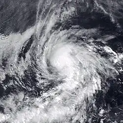 The remnants of the Atlantic's Hurricane Cora crossed into the eastern Pacific in mid-August,[4] becoming the easternmost of successive disturbances across the East Pacific basin.[5] It coalesced into a tropical depression by 18:00 UTC on August 18 and further into Tropical Storm Kristy within six hours.[6] The system acquired an eye on satellite on August 19,[5] and it was upgraded to a hurricane around 18:00 UTC that day. Kristy moved northwest and then west-northwest, further organizing into a Category 2 hurricane with winds of 105 mph (169 km/h) on August 21.[6] Thereafter, the system encountered cooler waters and drier air, which caused it to fall to tropical storm intensity. Environmental conditions improved again by August 25 as Kristy regained hurricane strength, but it soon encountered cooler waters again that prompted a more concrete weakening trend.[5] The cyclone stair-stepped into the Central Pacific prior to dissipating after 00:00 UTC on August 28.[6][7]