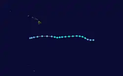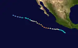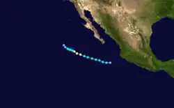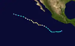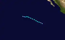 A small disturbance coincident with a tropical wave was first identified south of Acapulco on August 19.[4][5] The system moved west and coalesced into a tropical depression around 18:00 UTC on August 23.[6] The depression failed to intensify over subsequent days, and in fact, it was operationally downgraded back to a disturbance on August 26.[5] In the official database, the cyclone maintained its status and eventually intensified into Tropical Storm Miriam around 00:00 UTC on August 27.[6] Miriam turned west-southwest and entered the Central Pacific,[5] where it intensified into a hurricane at 12:00 UTC on August 28 and reached peak winds of 90 mph (140 km/h) twelve hours later.[6] Miriam then began to steadily weaken as it passed south of Hawaii,[5] and the cyclone dissipated after 00:00 UTC on September 2.[6]