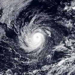 An area of disturbed weather spawned by a tropical wave developed southeast of Acapulco on July 11 and rapidly grew in size.[5] It developed into a tropical depression around 00:00 UTC on July 13 and further into Tropical Storm Gilma six hours later while curving from west-southwest to west-northwest.[5][6] Further organization brought Gilma to hurricane strength around 18:00 UTC on July 15 and major hurricane intensity by 06:00 UTC the next day.[6] By this point, satellite imagery revealed a system with a cloud shield about 920 mi (1,480 km) in diameter and an eye about 15 mi (25 km) wide. Immediately after peak, the effects of cold waters and dry air began to affect Gilma, and the storm weakened rapidly.[5] It degenerated to a disturbance after 00:00 UTC on July 20 while located well west of Baja California.[6] Its well-defined circulation tracked north of Hawaii before dissipating on July 27.[7]