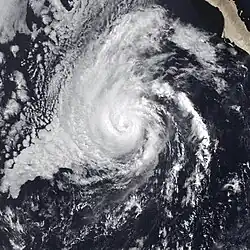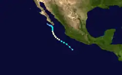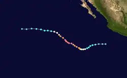 Two areas of disturbed weather focused south of the Gulf of Tehuantepec on October 1, one of which with origins as a tropical wave, underwent binary interaction and merged into one larger system the next day.[5] The disturbance was upgraded to a tropical depression around 18:00 UTC, and it further intensified into Tropical Storm Rosa by 00:00 UTC on October 3.[6] Rosa moved around the western periphery of an upper-level ridge,[5] strengthening over warm waters as it did so. The cyclone became a hurricane by 00:00 UTC on October 4, ultimately attaining peak winds of 85 mph (137 km/h) on October 4.[6] An aircraft reconnaissance plane intercepted the storm around this time, finding a 35 mi (56 km) elliptical eye open to the southwest.[5] Rosa moved northwest over colder waters, transitioning to an extratropical cyclone around 06:00 UTC on October 7 and ultimately dissipating west of Baja California after twelve hours.[5][6]