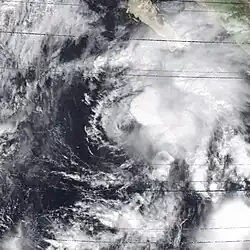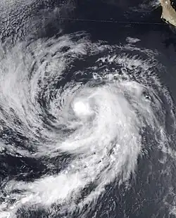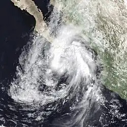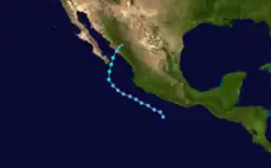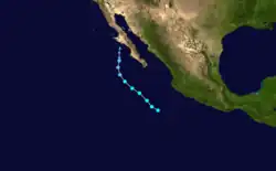 Tropical Storm Paul, the second system alongside Hurricane John without any genesis ties to the Atlantic,[4] was first identified north of Hurricane Olivia on September 22.[5] The system developed into a tropical depression by 00:00 UTC on September 23 but failed to intensify for several days thereafter. Finally, by 12:00 UTC on September 25, the system organized into Tropical Storm Paul.[6] It attained peak winds of 45 mph (72 km/h) six hours later as it curved toward the northeast, narrowly missing Baja California Sur.[5] Paul began to weaken as it approached the Mexico coastline, which it struck as a tropical depression around 12:00 UTC on September 26.[5] Six hours later, the depression transitioned into an extratropical cyclone,[6] which only persisted for an additional six hours before dissipating over northern Mexico.[5]