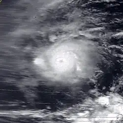 To the east of Tropical Storm Bud, a new tropical disturbance – originating as a Caribbean ITCZ disturbance – was identified south of Acapulco, Guerrero, on June 15.[4] The comparatively small system became a tropical depression around 06:00 UTC on June 17 and Tropical Storm Carlotta eighteen hours later while it moved over warm ocean waters.[5][6] After formation, Carlotta embarked toward the west-southwest, steered by the same ridge that directed Bud. The storm displayed a small eye in satellite imagery early on June 19,[5] and it was upgraded to a hurricane by 06:00 UTC that day.[6] Carlotta continued to intensify as it curved west-northwest,[5] becoming the season's first major hurricane around 06:00 UTC on June 20 and ultimately peaking as a Category 4 hurricane with winds of 130 mph (210 km/h) by 12:00 UTC on June 21.[6] Carlotta maintained its strength for a time before it encountered cooler waters and dry air on June 23.[5] The cyclone steadily lost strength and degenerated to a disturbance after 18:00 UTC on June 25 but remained a traceable entity as it moved across the Central Pacific. The disturbance moved across the Hawaiian island chain on June 28 and continued west, ultimately merging with a cold-core low after crossing the International Date Line. It was last identified over the West Pacific near Minami-Tori-shima on July 10.[7]