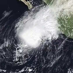 An area of disturbed weather southeast of Socorro Island became a tropical storm on October 28. It headed northeast and approached the coast of Mexico. However, an area of high wind shear and cool waters destroyed the cyclone on October 29, before it could reach the coast.[2] Newton was the tropical cyclone that came closest to making landfall this season. However, no impact was reported.[2]