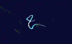 The system that was to become Tropical Cyclone Kina was first noted on November 6, while it was located just to the east of Tuvalu.[11][12] Over the next few days the system moved south-westwards and gradually developed further, before the JTWC reported that the system had developed into a tropical cyclone, with peak 1-minute sustained winds of 75 km/h (45 mph) during November 10.[12] During that day the FMS also reported that the system had developed into a Category 1 tropical cyclone on the Australian Scale and named it Kina.[11][12] The FMS subsequently estimated during the next day that the system had reached its peak intensity, with 10-minute sustained winds of 75 km/h (45 mph) during November 11.[11][12] Later that day the system's upper-level circulation became sheared off from its lower and moved southwards away from it.[11] The degenerating system subsequently passed to the west of Fiji during November 13, before it was last noted during November 16, as it passed over the island of Efate in Vanuatu but no damage was reported.[12][13] The system caused strong winds and rough seas on Viti Levu and in the Yasawas and Mamanutha group of islands.[11] Tourists on the Blue Lagoon Cruise in the Yasawas were forced to take shelter from Kina, while 18 people on another boat were temporarily listed as missing as they took shelter.[11]