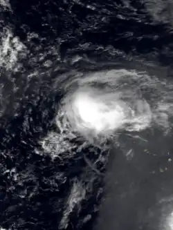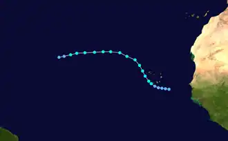On September 14, a well-defined tropical wave exited the coast of Africa. The next day, it had rapidly organized into a tropical depression. On the afternoon of September 16 the depression attained tropical storm strength, and it was given the name Fran. It turned to the northwest, and passed very near the Cape Verde.[38] 31 people were killed in the country.[39] Fran continued between the northwest and west-northwest on September 17–18 as it continued to organize. During this period satellite imagery indicated that Fran peaked with winds of 65 mph (105 km/h) and a minimum surface pressure of 994 mbar (29.35 inHg). As Fran passed the Cape Verde islands weather stations reported 35 miles per hour (55 km/h) winds, which is tropical depression force. During the period of September 19–20 Fran turned towards westward and began to encounter strong upper-level wind shear, which caused Fran to dissipate on September 20.[38]
