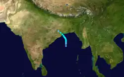 A broad and disorganized area of convection was first detected on October 9 in the north-central Bay of Bengal. The disturbance developed into a tropical depression on October 10. The depression moved north into very favorable upper-level and shear conditions. The JTWC subsequently upgraded the depression into a tropical storm, being designated as 02B. However, land interaction and outflow from a developing Tropical Storm Susan in the South China Sea inhibited any further development into a stronger system. 02B then moved slightly northwest as it attained its peak intensity of 50 mph, This was short-lived as strong upper-level shear began impacting the storm, gradually weakening it until making landfall 10nm (19 km) south of Balasore on October 14, before rapidly weakening overland and disspating that same day. Heavy rains were reported, but death and damage figures are unknown.[3]