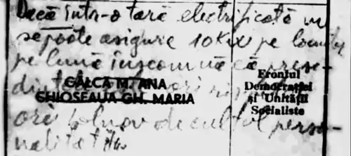 The communist status quo was being challenged by underground opposition forces, some of whom were grouped into the National Peasants' Party (PNȚ). Engineer Ion Puiu "issued a comprehensive political platform" for the PNȚ, calling on the PCR to respect constitutional guarantees and renounce its position as the vanguard party.[15] He then attempted to present himself as a candidate in the election, which led to his arrest by authorities.[16] Other figures associated with the group had been placed under constant Securitate surveillance. In April 1985, Securitate informant Iosif Constantin Drăgan reported that Corneliu Coposu viewed the election as "masterminded and falsified", noting that FDUS candidates in Sălaj County had received only positive votes.[17] Werner Somerauer, a Saxon photographer and pipefitter, also protested the election in Brașov County by stealing ballots which he preserved as "historical documents". This involved stuffing an urn with papers marked: Dați-ne mai multă carne! ("Let us have more meat!").[18]