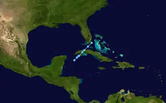Rainfall from the depression and its precursor peaked at 40.35 in (1,025 mm), including a daily peak of 34.13 in (867 mm).[11] The rainfall most affected the province of Cienfuegos, though the provinces of Villa Clara, Sancti Spíritus, Ciego de Ávila, and Camagüey were also impacted.[12] A tornado in the city of Camagüey destroyed five Soviet planes and multiple buildings.[13] Flooding prompted officials to use rescue crews, helicopters, and amphibious vehicles to evacuate 65,000 residents in low-lying areas to higher grounds. The storm left many without power and communications, severely damaged the country's transportation infrastructure, and destroyed six bridges.[13] Flooding from the depression damaged 1,000 houses and destroyed 200 homes in Camagüey Province alone.[14] Throughout Cuba, the depression affected about 90,000 people, injuring dozens[15] and killing a total of 37 people,[12] including three who died from electrocution.[13] In Florida, the depression produced light rain, including 3.18 in (81 mm) at Pompano Beach.[16]