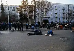 Gamsakhurdia called his followers from the all provinces of Georgia to gather in Tbilisi and clear the streets from barricades.[19] On 21 September, the government supporters launched an assault to clear the Rustaveli Avenue from the barricades blocking the street. On 22 September, a group of several dozens of protesters who were on hungerstrike in front of Parliament were violently dispersed by 250 presidential guards and around 200 "furies", women partisans of Gamsakhurdia.[31] On the night of 22–23 September, the situation fell even further into violence when around 5,000 Gamsakhurdia supporters, led by deputy Avtandil Rtskhiladze, entered the headquarters of the NDP, where they faced some 800 members of the opposition.[31]