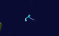 In addition to the 11 named storms, one of which failed to attain tropical storm status, there were several additional systems. The first was Tropical Depression C1, that originated from the ITCZ in the northeastern portion of the basin from a small area of convection on November 24. It moved westward with pulsating convection around the center, failing to organize due to the presence of wind shear. On December 4, the system organized into a tropical disturbance, and three days later it passed about 400 km (250 mi) north of the northern tip of Madagascar.[4] That day, it intensified to tropical depression status, reaching peak winds of 50 km/h (30 mph).[20] Increased wind shear weakened the convection, and the circulation dissipated on December 10.[4] On December 18, a tropical low developed in the Australian basin northeast of the Cocos Islands. It moved southwestward, intensifying into a tropical storm and being named Ken by the BoM. Wind shear in the region prevented much development, and the storm crossed into the south-west Indian Ocean on December 21.[21] At that time, the MFR classified the system as Tropical Depression C2, but the agency only issued two warnings.[4] The JTWC tracked the system until December 23 when the system dissipated well to the southwest of Indonesia.[6]