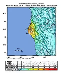 The region near the triple junction experiences high seismicity, with more than 60 earthquakes of intensity VI (Strong) or greater or magnitudes ≥ 5.5 since 1853. The mainshock in the sequence (11:06 a.m. Pacific Daylight Time) occurred onshore, 4 kilometers (2.5 mi) west of Petrolia at a depth of 10.5 kilometers, and was among an infrequent number of earthquakes with fault-plane solutions that conveyed evidence of slip at the Cascadia subduction zone. While the focal mechanism indicated slip on a thrust fault striking N.10°W with a shallow dip of 13° to the east-northeast, the rupture most likely propagated to the west, based on the mainshock location at the southeastern boundary of the aftershock zone. Investigation of more than 1,200 surveys from the North Coast area led to the assignment of an intensity rating of IX (Violent) on the Modified Mercalli scale for the region near Petrolia.[8]