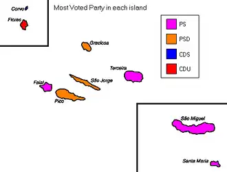 The Socialist Party, under the leadership of Carlos César, was the first party with 45 percent of the votes, in comparison to their direct rivals, the Social Democratic Party who won 41 percent, although both parties were tied in seats with each party winning 24 MPs.