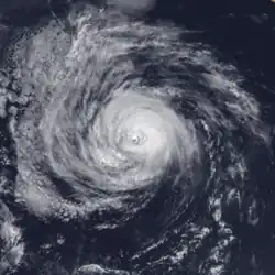 Located in an area conducive to further development, Darby attained hurricane status on July 24, subsequent to the development of a 17-mile (27 km)-wide eye.[17] The eye became more distinct while surrounded by an area of deep convection, and on July 25 the hurricane reached peak winds of 115 mph (185 km/h) about 850 miles (1,370 km) southwest of Cabo San Lucas.[18] The eye soon disappeared on satellite imagery, believed to be from an eyewall replacement cycle, and Darby's winds weakened to about 105 mph (169 km/h). A 25-mile (40 km) eye next developed, and on July 26, the hurricane re-intensified to reach peak winds of 115 mph (185 km/h).[17] For a 30-hour period, Darby attained the characteristics of an annular hurricane, retaining a well-defined structure with few banding features for an extended period.[19] The hurricane began to weaken while entering an area of cooler water and increased wind shear, and after crossing into the jurisdiction of the Central Pacific Hurricane Center, Darby weakened to a tropical storm on July 29. The storm degenerated into a tropical depression on July 31, and early on August 1, Darby dissipated a moderate distance north of the Hawaiian Islands. It never affected land.[17]