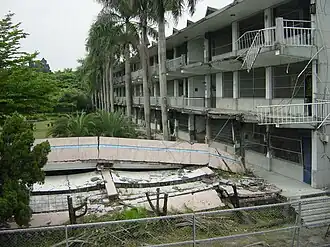 Damage caused by the earthquake included 2,415 deaths, 29 missing, 11,305 severely wounded, with 51,711 buildings completely destroyed, 53,768 buildings severely damaged, and a total of NT$300 billion (US$10 billion) worth of damage.[18] Power was cut to a large proportion of the island, due to damage to power stations, transmission stations, and the automatic shutdown of Taiwan's three nuclear power plants, which were restarted two days later.[19] National electricity provider Taipower stated that a day after the quake power had been restored to 59% of the country.[20] 102 major bridges were badly damaged, with many having to be torn down.[21] The Central Cross-Island Highway, at the time the only major complete route across the mountains in central Taiwan, was badly damaged. Subsequent storm damage and the high cost of restoration means that the highway remains partially closed as of 2018. There were a total of 132 landslides during the main quake and the aftershocks, some causing loss of life as rockfalls crushed houses.[22] 870 schools suffered damage, with 125 severely damaged, closing many down for months or even permanently in a few cases.[23]