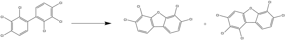 PCBs can be used to synthesise polychlorinated dibenzofurans, including tetrachlorinated dibenzofurans (TCDF) and pentachlorinated dibenzofurans (PenCDF). These compounds share a similar structure with polychlorinated dibenzo-p-dioxins. In particular, 2,2’,3,3’,4,4’-hexachlorodiphenyl is used to synthesise TCDF-3467 and PenCDF-12367. The synthesis is conducted with oxygen between 550 – 600 °C for 5s.[9]