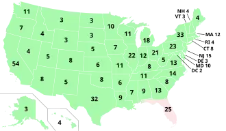 The United States Electoral College is the group of presidential electors required by the Article Two of the Constitution to form every four years for the sole purpose of electing the president and vice president. Each state appoints electors according to its legislature, equal in number to its congressional delegation (senators and representatives). Federal office holders cannot be electors. Of the current 538 electors, an absolute majority of 270 or more electoral votes is required to elect the president and vice president.[6] As stated in the Twelfth Amendment to the United States Constitution, if no candidate for either office achieves an absolute majority there, a contingent election is held by the United States House of Representatives to elect the president, and by the United States Senate to elect the vice president; under this amendment, only the election of 1824 failed to produce a majority for president, and the election of 1836 for vice president.