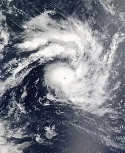 Around the same time that Tropical Storm Gerry was developing, another area of convection to its east was organizing.[31] On February 7, the system became a tropical disturbance, and initially moved to the north.[34] Operationally, MFR first began issuing advisories on February 9 for Tropical Disturbance 11, when the system had a small center and accompanying convection. By that time, the disturbance had turned to the south, and favorable conditions allowed for gradual development.[31] MFR upgraded the system to tropical storm status late on February 9,[34] although the system was not named Hape until 36 hours later. On February 10, the JTWC initiated advisories on Tropical Cyclone 17S. An eye developed on February 11, suggesting quick intensification.[31] At 1800 UTC that day, the JTWC and MFR upgraded Hape to the equivalent of a minimal hurricane and to tropical cyclone status, respectively.[34] By that time, the cyclone had turned to the east-north-east due to a weakness in a ridge to the north.[31] MFR estimated that Hape reached peak 10-minute winds of 150 km/h (93 mph) on February 12, and the next day the JTWC estimated 1-minute winds of 165 km/h (103 mph). Later, the storm weakened, and it turned to the south-east when the ridge re-intensified. Outflow decreased due to interaction with Cyclone Gerry to the west,[31] and Hape weakened to tropical storm status on February 13.[34] On February 15, the JTWC discontinued advisories once the circulation was exposed from the deep convection. The next day, MFR followed suit after the circulation dissipated.[31]